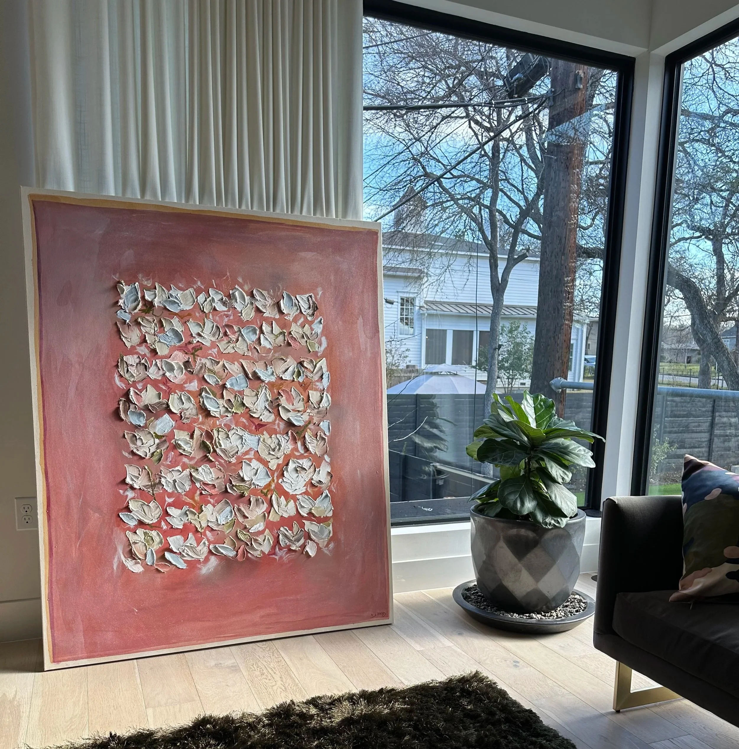 Guided by memory and intuition, she often incorporates Urdu script into her work fragments of language that carry prayers, poetry, and inherited wisdom. These subtle inscriptions are not always meant to be read, but felt. They serve as bridges between past and present, homeland and home, honoring her Muslim heritage while inviting universal connection. Through layered strokes of oil and mixed media, language and pigment become vessels for identity, devotion, and belonging.